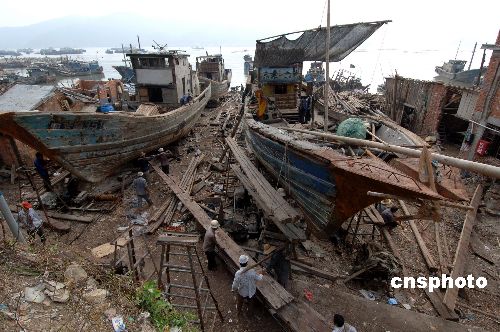 八月十七日,福鼎沙埕港的渔民正在修理被“桑美”台风破坏过的渔船,开始恢复生产自救。“桑美”台风已经过去一周,然而此次五十年一遇的超强台风给重灾区福鼎沙埕港带来了无尽的苦难,几乎所有的木式房子都被摧毁,渔船被破坏,目前,灾区农民已开始有序的生产自救。中新社发 王东明 摄