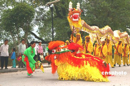 9月29日,齐云山脚下龙腾狮舞庆国庆迎中秋。当日下午,安徽休宁齐云山脚下的岩脚农民龙狮队在齐云山大道上龙腾狮舞,忽左忽右,忽高忽低,忽摇头忽摆尾,或腾空跃起,或盘旋翻滚,与全国4A级名胜风景齐云山交相辉映。中新社发 方也广德 摄