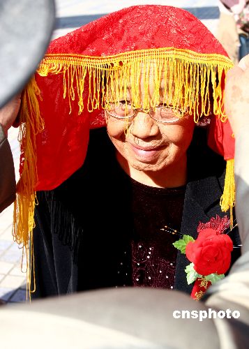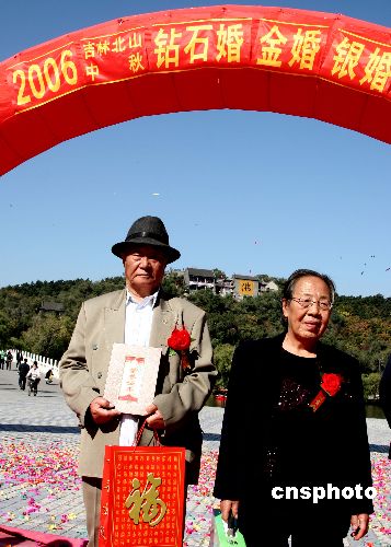 10月6日,84岁的王有为老人为79岁的老伴掀起红盖头。当日是传统的中秋佳节,吉林省吉林市北山风景区举办了庄重热烈的“2006钻石婚、金婚、银婚庆典”活动,吸引了许多游客参加。中新社发 朱万昌 摄