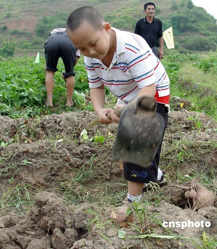 十一国庆黄金周,来自城里的小孩在父母的陪同下,纷纷下乡体验“劳动游”。图为来自深圳的小孩在福建连城乡村田野上挖红薯。中新社发 王东明 摄
