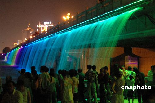 十月六日晚,广西南宁市南湖大桥大型景观瀑布银河飞泻,每侧的喷水面长二百五十米,整座桥梁上装有成千上万的七彩高强度发光灯,当景观瀑布在夜间喷水时,瀑布会呈现赤橙黄绿青蓝紫等不同颜色,与空中的圆月交相辉映,将南宁的中秋之夜打扮得如诗如画。中新社发 蒋雪林 摄