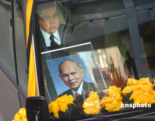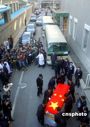 十月三十一日上午九点,覆盖国旗的霍英东灵柩在家属和医护人员的陪同下被送离北京协和医院,前往首都机场。中新社发 廖攀 摄
