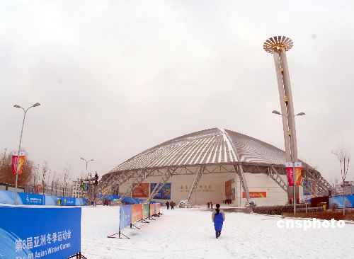 一月二十九日,长春亚冬会开赛第一天,长春降起大雪,亚冬圣火在冰雪中燃烧。今年进入冬季以来吉林降雪严重偏少。中新社发 廖攀 摄