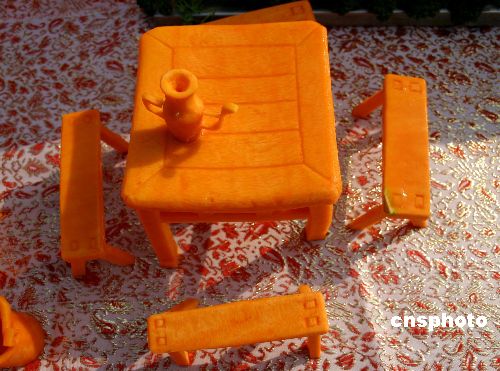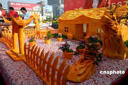 2007年2月10日,湖北宜昌西陵庙会上,一酒店展示一组用南瓜艺雕菜肴,吸引了许多观众。中新社发 谭大学 摄