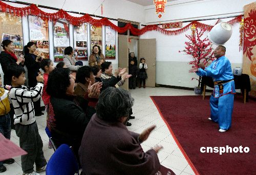 2007年2月13日,北京东城区文化馆广场举办第17届新春室内文化庙会,庙会以讲述老北京民俗、体现“奥运文化”为主题,既有广场舞蹈大赛、迎春花会、皮影表演,也有科学表演、快乐歌舞吧。庙会将持续到22日。中新社发 鲁谷 摄