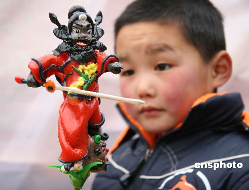 2月15日,农历春节将到,在安徽蒙城县历史文化广场,一位民间艺人用手捏制的、各种颜色的泥人,吸引了孩子们的眼球。中新社发 胡卫国 摄