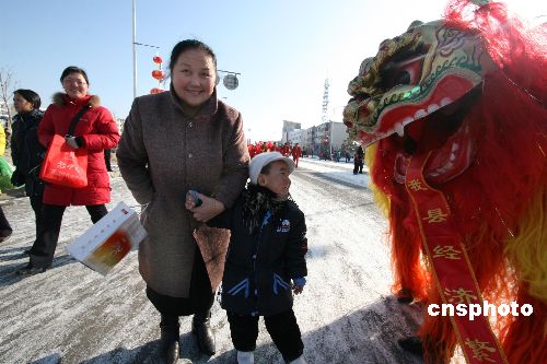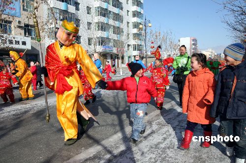 2月15日是腊月二十八,新疆富蕴县群众在进行社火表演,各族干部群众、农牧民参加了社火表演活动。中新社发 丁宁 摄
