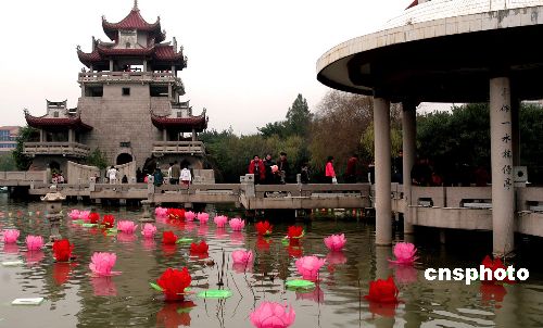 二月二十一日,为了营造春节气氛,侨乡泉州东湖公园的湖面上设置了各种造型精美的花灯,吸引游人观赏。中新社发 傅丹丹 摄