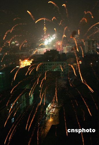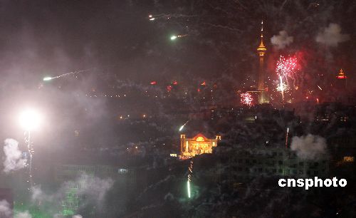 2月22日是农历新年“破五”,暮色降临之际,北京城内烟花爆竹遍地开花,其声势仅次于除夕之夜。今年春节期间,北京人燃放烟花爆竹的热情格外高涨,虽然增添了浓浓的节日气氛,但也给都市环境造成一定程度的污染。中新社发 任晨鸣 摄