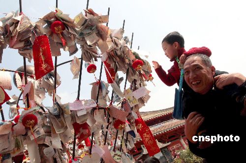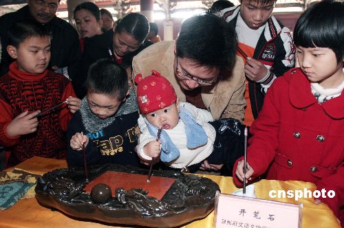 二月二十四日,在泉州市府文庙大成殿内,孩童们用毛笔在“开笔石”上写下自己的名字,进行开笔礼,殿前的一棵许愿树上,也挂满了侨乡学童对新学期的愿望。本日,来自市区各地约有上万名学子到府文庙拜孔子,祈求学业有成。中新社发 傅丹丹 摄