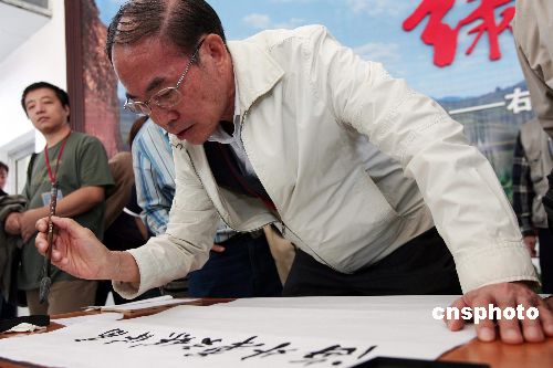 出席第二届海外华文媒体高层访问团“杏花村”三晋文化之旅的媒体成员们八月三十日在山西省右玉县采风。图为澳门日报常务副总编辑黎胜培在题词抒发情感。中新社发 张云 摄