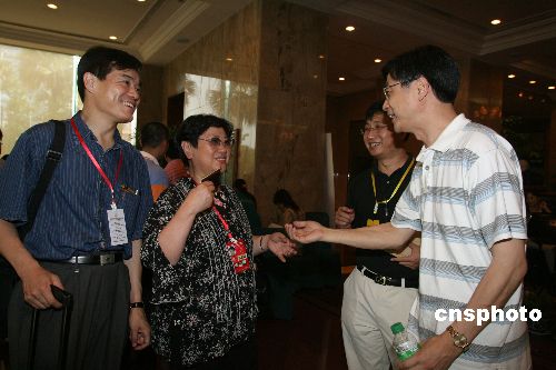 参加第四届世界华文传媒论坛的代表9月1日陆续抵达四川成都,法国《欧洲时报》社长杨咏橘(左二)、《欧洲联合周报》执行社长张晓贝(左一)在下榻宾馆受到中新社总编辑刘北宪(右一)的欢迎。据介绍,共有来自世界各地的300家华文媒体的约400名代表出席本次论坛。中新社发 张勤 摄
