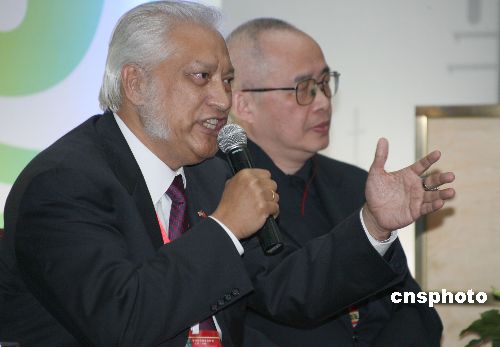 9月2日,第四届世界华文传媒论坛在四川成都开幕,印尼《国际日报》董事长熊德龙(左)、香港《亚洲周刊》总编辑邱立本(右)在开幕式后举行的“媒体高端论坛”上先后发言。中新社发 张勤 摄