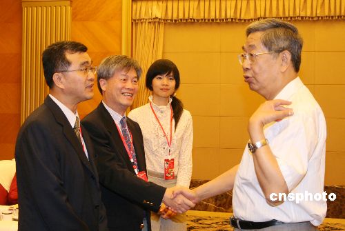 9月2日,第四届世界华文传媒论坛在四川成都开幕,全国人大常委会副委员长许嘉璐会见参加该论坛的台湾媒体代表。中新社发 郭晋嘉 摄