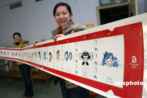 1月8日,河南省许昌市邮政局集邮公司的工作人员在展示《奥运大长卷》。《奥运大长卷》巨幅邮票是北京奥组委破例审批的超大规模奥运珍品邮票,总长达到6.33米。该邮票包含了北京奥运会会徽、吉祥物、38个运动分项造型和北京奥运口号等,有128枚连接在一起,单个项目福娃的规格是普通邮票的25倍,是史上规模最大和奥运邮票最全的北京奥运特种邮票长卷。据悉,6.33米长的《奥运大长卷》邮票比以往我国发行的《清明上河图》邮票长卷还要长上1米多,其长度和包含的邮票内容都创造了奥运邮票发行的新纪录。中新社发 牛书培 摄