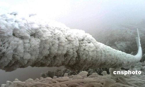 中国广西最近遭遇严重雨雪冰冻灾害,电力、通讯设施受到严重影响,图为中国移动广西公司在柳州市融安县一个超负荷的移动光缆被冰雪冻结。中国移动广西公司已启动最高等级应急通信方案,全力保障通信网络畅通,向重灾区提供信息发布绿色通道和延迟停机等服务,为抗灾救灾提供通信保障。中新社发 申蓓 摄