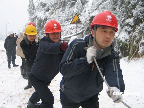2月4日,电力工人正在海拔千余米的仰峰雪山顶拉线抢修。自1月15日起,江西省宜春市洪江乡遭遇持续雨雪冰冻天气灾害,由洪江乡通往仰峰村的近40根电线杆倒塌,致使300余户村民停电。袁州区供电公司组织三个电力抢修班,日夜在仰峰雪山上抢修,确保除夕日恢复供电。中新社发 邹海斌 摄