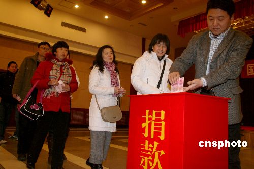 五十年一遇的罕见雪灾仍旧肆虐着中国南部的一些省份,为了帮助受灾地区群众抗灾,二月四日,国务院侨办组织自愿捐款活动,侨办主任李海峰,副主任许又声、马儒沛、任启亮,中国海外交流协会副会长林文肯及侨办机关和直属单位的领导干部,将一份份“爱心”投入捐款箱中。据统计,此次捐款活动共收到干部捐款和下属单位捐款二百零六万二千六百三十元人民币。中新社发 张勤 摄