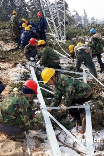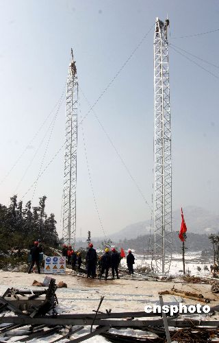 一座塔倒下去,又一座塔立起来,湖南望城县桥驿镇月塘村华沙线500千伏塔,电力工人罗海文、罗长明、周景华不幸遇难的送变电倒塌电塔现场,经过湖南省送变电建设有限公司三分公司140多职工和120名武警官兵日夜抢修,2月3日,在原41号铁塔的废墟上立起了一座新塔。另外44、43号倒塌的铁塔也在近日修复。中新社发 殷中民 摄