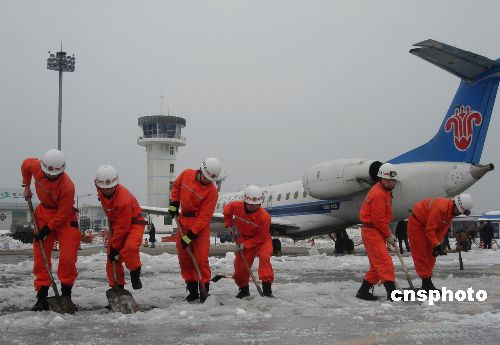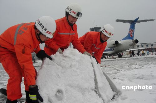 2月4日至5日,贵州铜仁地区公安消防、武警、民兵应急分队600余人出动装载机、推土机、清雪车和洒水车,在铜仁大兴机场使用消防水枪清除跑道冰雪,以确保机场在2月6日恢复通航。背景资料:贵州铜仁地区大兴机场是贵州第一个支线机场,现已开通直接往返北京、广州、深圳、重庆、贵阳、长沙等大中城市的航班。据悉,该机场从1月12日遭受严重凝冻天气以来停航至今。中新社发 陈晓岚 摄