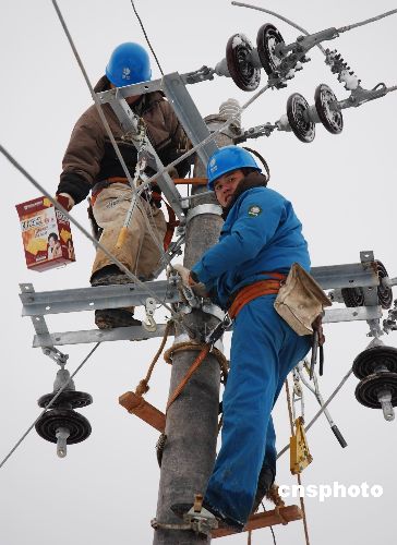 2月6日,电力抢修队员在海拨600米的高山雪地里吃年夜饭。据悉,近日雪灾造成浙江嵊州21条主要供电线路中断供电,该市供电局每天出动500余人进行抗灾自救。2月6日,该市供电局200多名党员干部组成6支电力抢修突击队员,对该市贵门、里南、长乐3个未通电乡镇开展春节供电大会战,当晚6时前,该市全面修复供电,实现新春零断电。中新社发 张亮宗 摄
