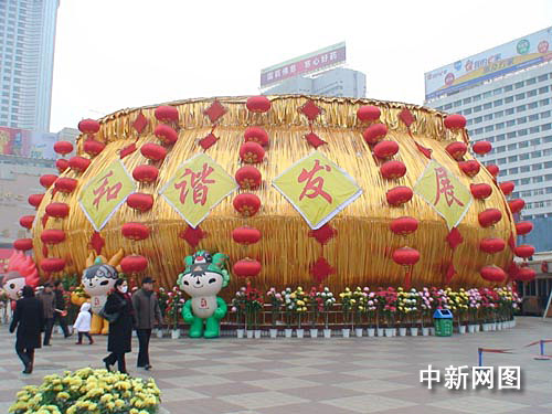 自2月1日一盏巨型灯笼亮相甘肃兰州东方红广场后,2月10日5个不同的福娃造型也喜庆地出现在人们视野中。与其它景点不同的是,这一景点以民俗、奥运为主题,凸显了奥运文化特色。据悉,巨型灯笼直径为23米、高9米,于2月2日晚开灯亮相至今日,吸引了众多的游客驻足观看。 聂娟 摄