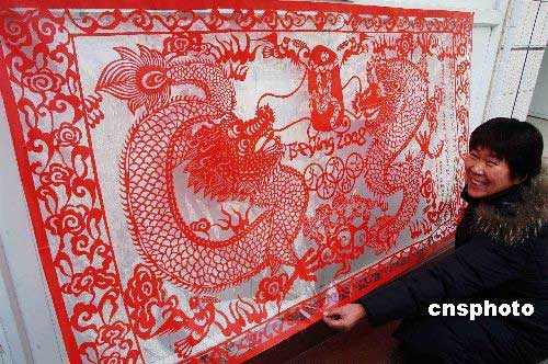 河南周口市剪纸女艺人陈雪英用了一周时间创作出剪纸作品“龙迎奥运”。该幅作品长2米,宽1米,上刻有双龙飞腾,奥运五环、福娃踏云、吉祥白鸽及北京2008等图案和字样。以中华民族的图腾龙为主题的迎奥运作品充分表达了作者对北京奥运的期盼和祝福。中新社发 杨正华 摄