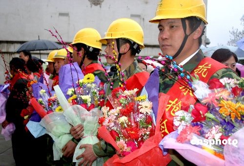 2月25日,江西赣东北供电公司50余名电力队员,完成井冈山抗冰雪抢修任务后,从井冈山回到乐平。当日,千余名赣东北供电领导、抢修队员家属和乐平群众冒雨相迎。中新社发 王国红 摄