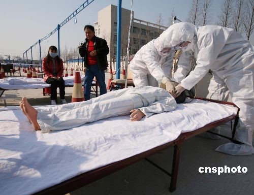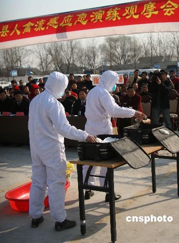 3月5日,安徽蒙城县举行人禽流感防治应急处置演练,从县卫生医疗机构抽调的有关人员分别参加了人员防护着装与卸装、病人就诊、疫情报告、医疗救治、院内疫情流调防控及病人救治、病人居住地疫情防控、应急处置等七个部分的实地演练。据悉,演练旨在检验人禽流感防治预案的可操作性和执行效果,测试医疗卫生机构卫生应急及医疗救助能力,提高全县应对突发公共卫生事件应急处置能力。中新社发 胡卫国 摄