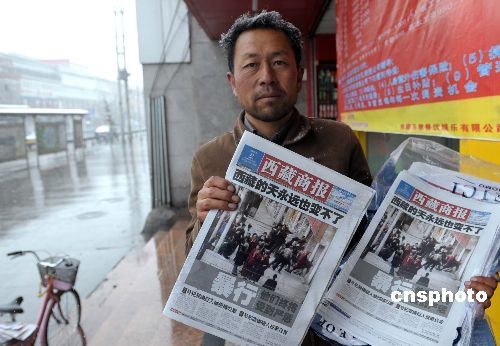 3月21日,一名拉萨市民顶着风雪在拉萨街头售卖揭露不法分子打砸抢烧罪行的报纸。拉萨市3月14日发生的打砸抢烧严重暴力犯罪事件,给当地人民群众生命财产造成重大损失,使当地社会秩序受到严重危害。中新社发 廖攀 摄