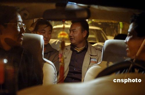 3月24日晚,拉萨火车站广场外,由于出租乘客减少五位出租车司机坐在同一辆车内消夜等候乘客。3·14事件影响了民众夜间出行,拉萨出租车乘客锐减。中新社发 廖攀 摄