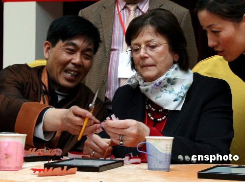4月10日上午,国际奥委会主席罗格夫人在北京参观京城百工坊时,向百工坊剪纸大师学习中国传统剪纸艺术。中新社发 宋吉河 摄