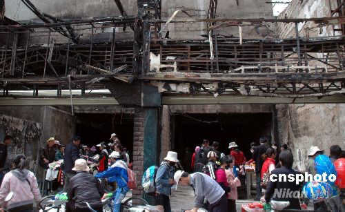 4月12日,昔日繁华似锦的拉萨市朵森格路又恢复了往日的景象。街道上车水马龙,人来人往,各种商品琳琅满目,选购的人们络绎不绝,尽管在“3.14”暴力事件中许多被焚烧成废墟的经营大楼还处在修复之中,但整个市场交易已呈现出十分火红的景象。中新社发 周波 摄