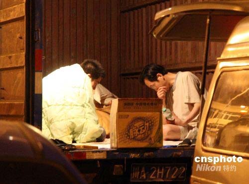5月12日晚,成都的众多市民均聚集在空旷地区或广场过夜。据悉,截至13日零点,四川灾区死亡人数已达近万人。图为两名当地市民在停在广场边的货车箱内过夜。中新社发 郭晋嘉 摄