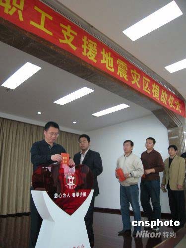 5月12日四川发生强烈地震后,辽宁民众情牵灾区。从5月14日开始,辽宁各企事业单位干部和职工纷纷踊跃捐款,支援四川抗震救灾。图为14日上午,辽宁省民政厅300余名干部和职工热心捐款。中新社发 沈殿成 摄