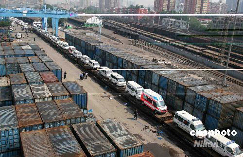 5月15日,由北京市卫生局组织的70辆救护车和3辆指挥车,满载救灾物资从北京广安门火车站驶出,奔赴四川地震灾区。中新社发 富田 摄