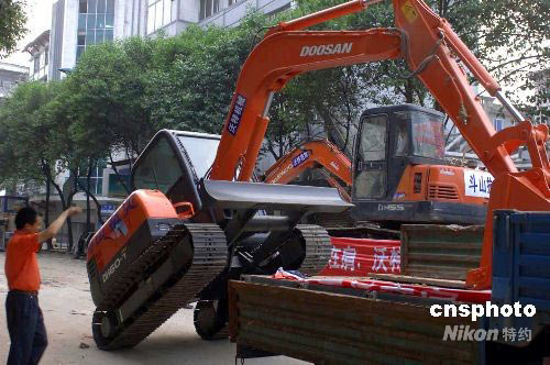 2008年5月15日,地震灾区都江堰市危楼排险工作正在进行中。目前来自成都市企业的志愿抗震救灾队伍携带大型机械车辆开进都江堰市区,与解放军部队一起展开危楼居民区的排险、救灾、防疫工作。图为成都市一企业,派数量可观的大小挖掘机和破损机进入江堰市危楼疏散区。汶川7.8级地震,给都江堰市带来巨大破坏。目前危楼居民区疏散、安置工作已展开,取得一定成果。中新社发 邹宪 摄
