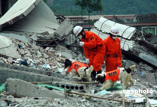5月15日,四川地震重灾区北川县,重庆消防官兵动用搜救犬在北川中学废墟中搜寻幸存者。中新社发 万明 摄