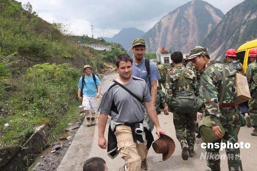 5月14日,从都江堰到汶川县映秀镇沿线民房和交通受损严重,许多受困的居民纷纷离家赶往安全地点,也有许多居民想回家看往地震区的亲人。图为受困的外国游客在前往安全地点的途中。中新社发 黄荣 摄