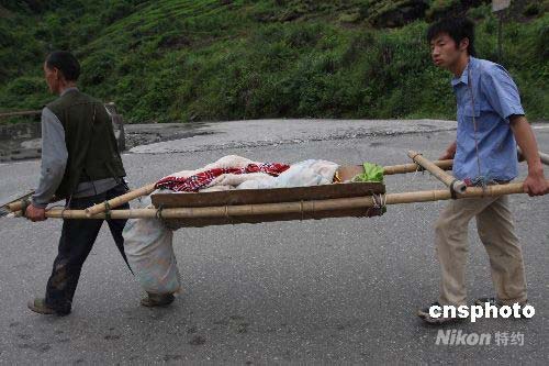 四川大地震,从都江堰到汶川县映秀镇沿线民房和交通受损严重,许多受困的居民纷纷离家赶往安全地点,也有许多居民想回家看往地震区的亲人。图为14日,友谊隧道附近的灾民把受伤的孩子运往外面进行医治。中新社发 黄荣 摄