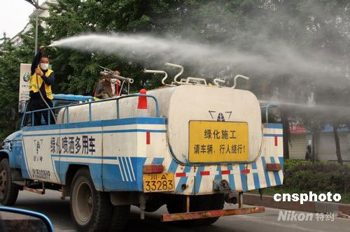 5月16日,四川都江堰市对市区及灾民安置点周边环境进行消毒,加强防疫工作。中新社发 张雷 摄
