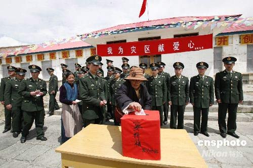 5月16日,驻守在海拔4500多米的青藏兵站部某大站黑河兵站官兵拿出津贴向四川灾区民众献上一份爱心。兵站的藏族职工索朗嘎姆、加里等也加入了捐款行列。中新社发 邹小庆 摄