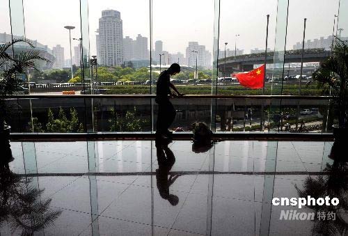 5月19日,上海徐汇区一所建筑内,一名青年面对窗外降半旗的国旗沉思。为表达各族人民对四川汶川大地震遇难同胞的深切哀悼,中国政府决定,2008年5月19日至21日为全国哀悼日。在此期间,全国和各驻外机构下半旗志哀,停止公共娱乐活动,外交部和中国驻外使领馆设立吊唁簿。5月19日14时28分起,全国人民默哀3分钟,届时汽车、火车、舰船鸣笛,防空警报鸣响。中新社发 廖攀 摄