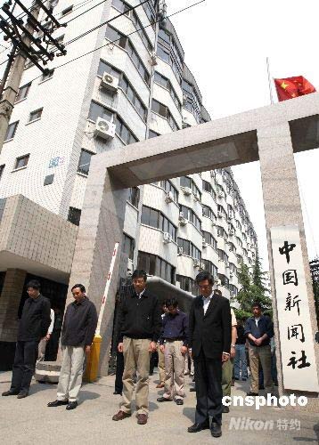 5月19日,中国首个全国哀悼日,14点28分,北京全城响起警报声,中国新闻社总社全体值班员工在社领导率领下,在该社大门口列队为四川汶川大地震中遇难同胞默哀三分钟。中新社发 任海霞 摄