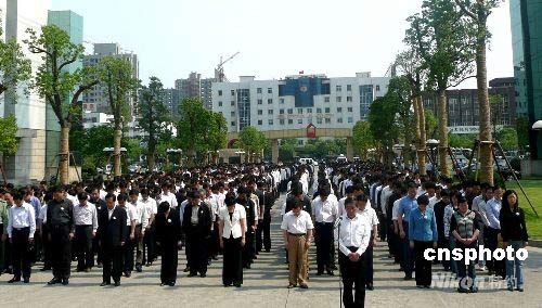 5月19日, 扬州市委、市人大、市政府、市政协,各区委、区政府及市直有关部门下半旗,沉痛哀悼四川地震遇难同胞。14时28分起,全市人民默哀3分钟,汽车、火车、船舶鸣笛,各防空警报点防空警报鸣响。在全国哀悼日期间,停止公共娱乐活动,开展一系列的哀悼活动,以表哀思。截至18日晚,扬州市募集赈灾捐款突破千万元人民币。图为扬州市政府大院全体工作人员胸佩白花集体列队默哀。中新社发 崔佳明 摄