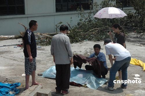 53岁的四川绵竹东方汽轮机厂女职工王发珍创造了生命最光辉奇迹,她在汶川大地震当天被埋在六层楼房下,七天之后的5月19日上午被抢救出来,还呼喊着救命,但终因抢救无效死亡。图为她的儿子(右二)用一件衣服为母亲遗体遮挡太阳,久久不愿离去。中新社发 肖龙联 摄