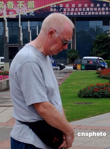 5月19日14时28分,广西南宁市民自发聚集在民族广场为四川地震遇难同胞致哀,一名外国朋友行至此地,也同中国民众一样低头为遇难者默哀。中新社发 刘万强 摄