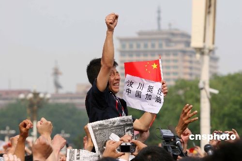 5月19日14时28分,北京天安门广场上的民众为四川汶川大地震遇难者默哀3分钟。一位来自四川的男子高举右手为灾区加油。中新社发 富田 摄