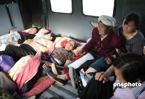5月19日,铁军官兵翻山越岭6个多小时到达阿坝藏族羌族自治州三江乡,将包括10名藏族灾民在内的15名重伤员利用直升机运往成都进行救治。中新社发 曾宪平 摄