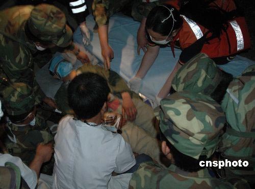 5月20日凌晨4时,在云南驻滇某部刘清泉副师长等百名战士护送下,被埋172小时的安县雎水道禧村六组的矿工彭国华成功获救,创造了生命的奇迹。中新社发 王荔 周保全 摄